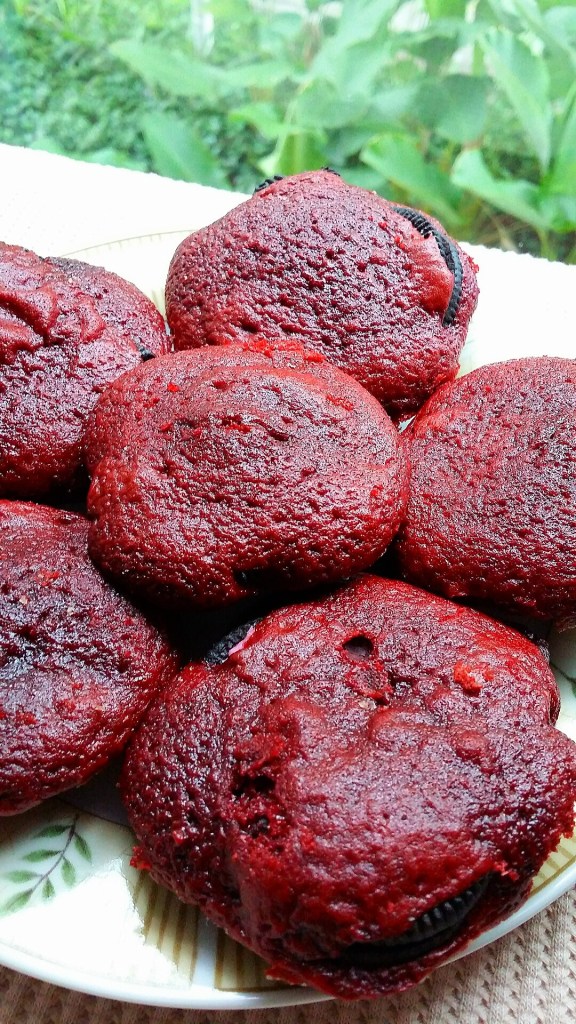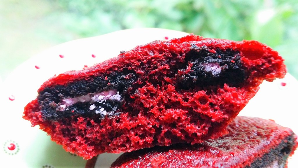 As soon as I removed the tray from my oven, the tea cakes’ strikingly vibrant colors stood out – a bold red hue with pops of deep brown and peeks of rose pink. The aesthetics I aspired to curate is inspired by café-style Oreo muffins, in the form of red velvet tea cakes. The combo of red velvet, Oreo cookies and strawberry cream is a match made in heaven! The flavors blend perfectly together, resulting in a sweet tooth’s ultimate dream.