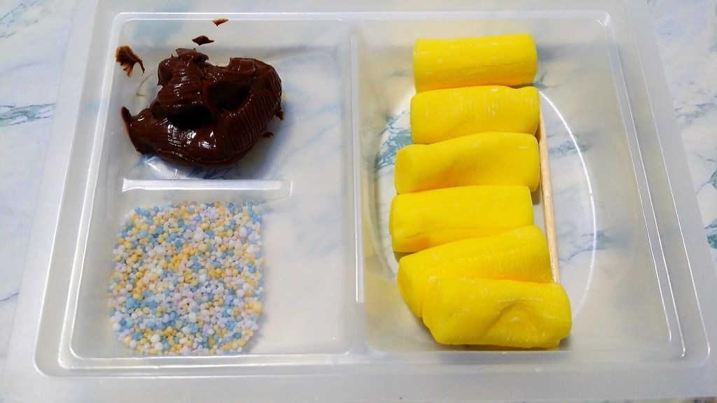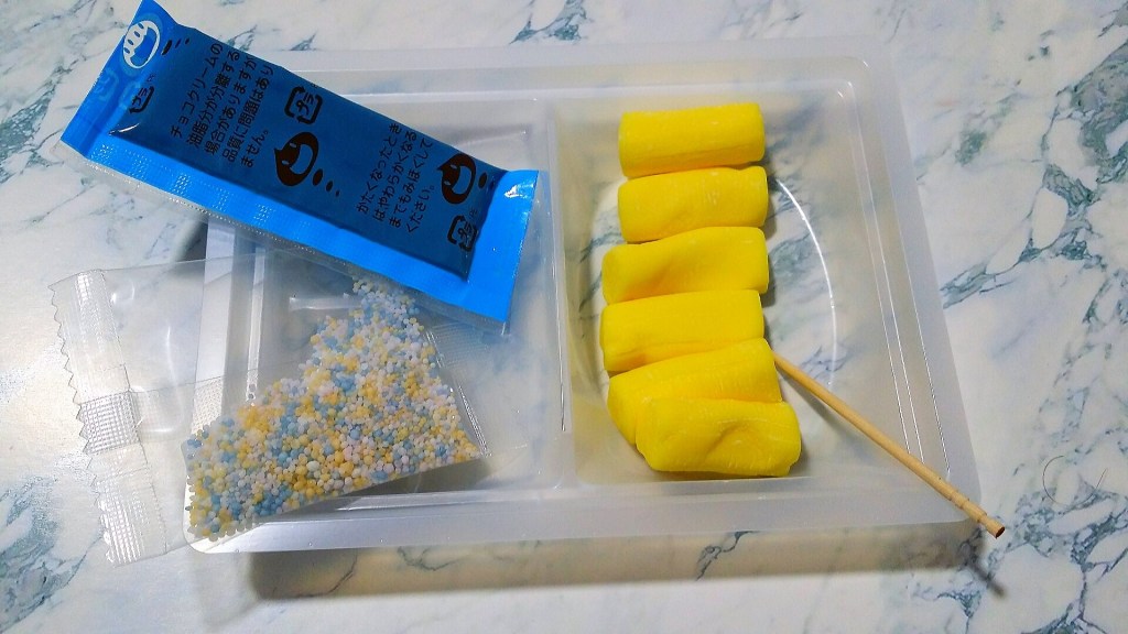 In good ol’ Japanese candy kit fashion, everything in the package has been thought through carefully – a plastic tray with different compartments to place various elements, and a toothpick-looking skewer (perhaps more so a toothpick as a makeshift skewer!) are included. The headliners are prepared well too: a blue-colored packet containing a chocolate sauce, a transparent packet of sprinkles which greeted me with its pops of blue and yellow tones, and six pieces of sunny-like banana candy.
