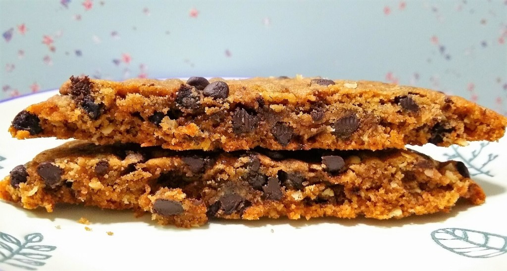Firstly, the scent is AMAZING. I wish my camera could capture the aroma, because it exudes vibes of warmth and bliss. A batch of classic American-style cookies that we know and love is the result. They’re the kind of cookies that I adore: lightly crispy around the edges and soft in the center. There is a shadow of oats in each bite, as the oats are the supporting crew to chocolate chips’ star quality.