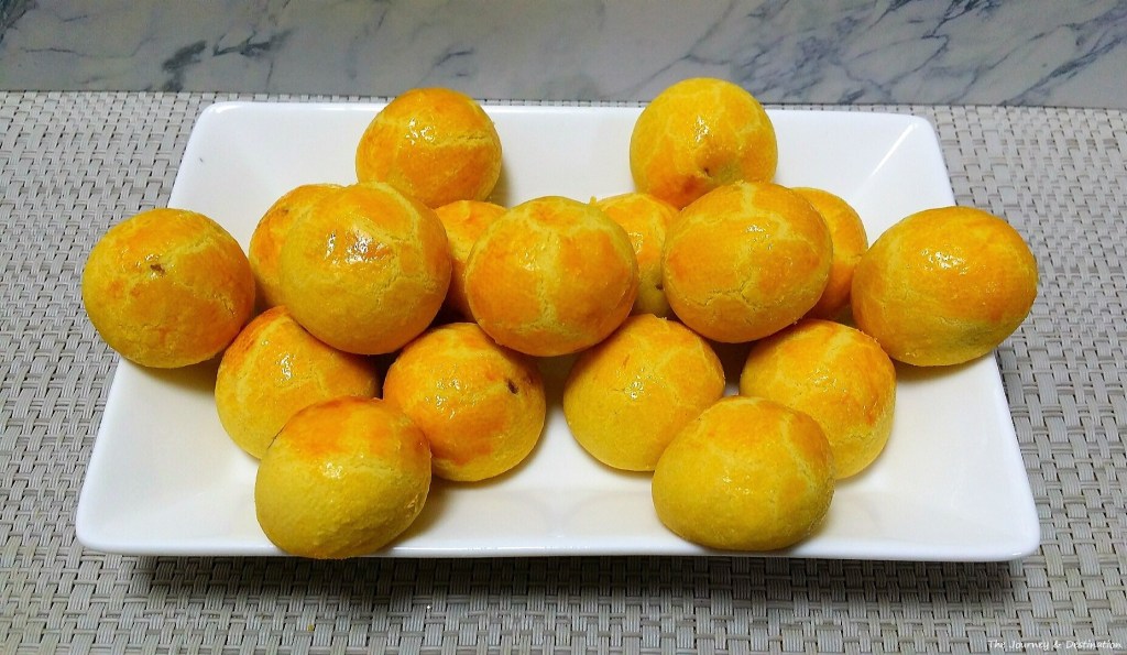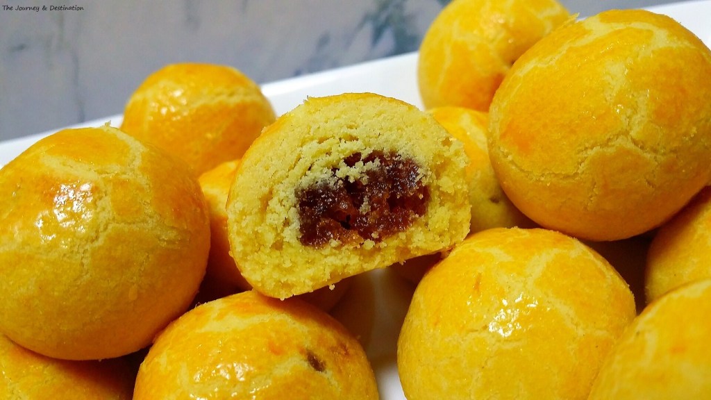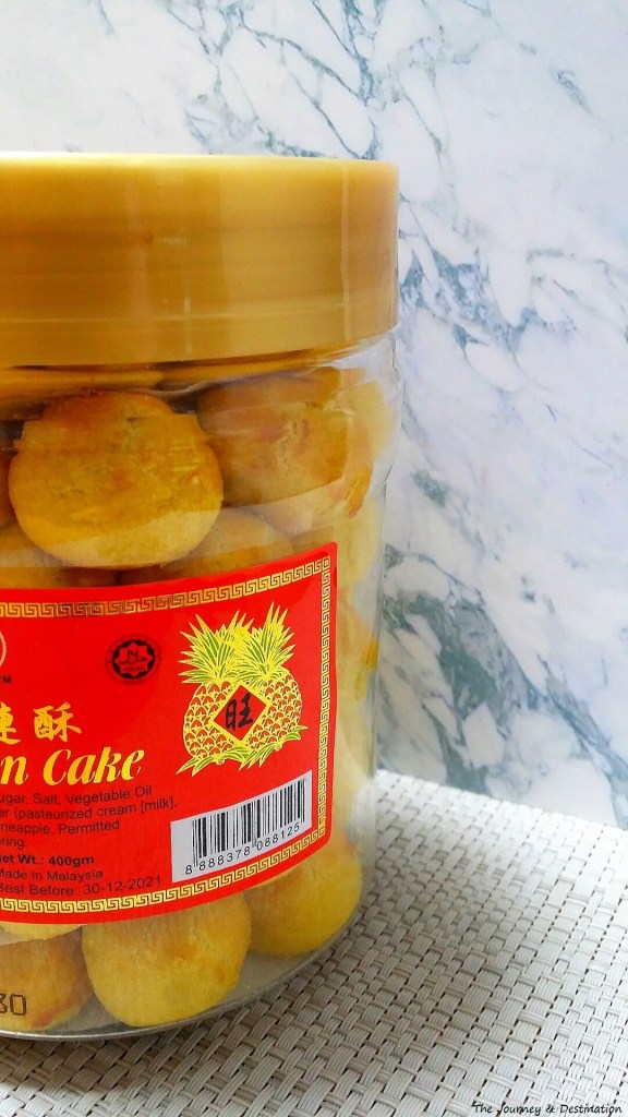 Dome-shaped cakes (which I refer to as ‘cookies’ because they’re much closer to the cookie family’s lineage) are a little larger than the size of gumballs. Each piece is stacked immaculately in a quintessential, medium-sized festive cookie bottle, which has the same purpose as a cookie jar. Filled with durian and pineapple jam (check out the pineapple jam tarts post to learn more!), this is certainly the most peculiar yet intriguing durian treat I’ve ever purchased!