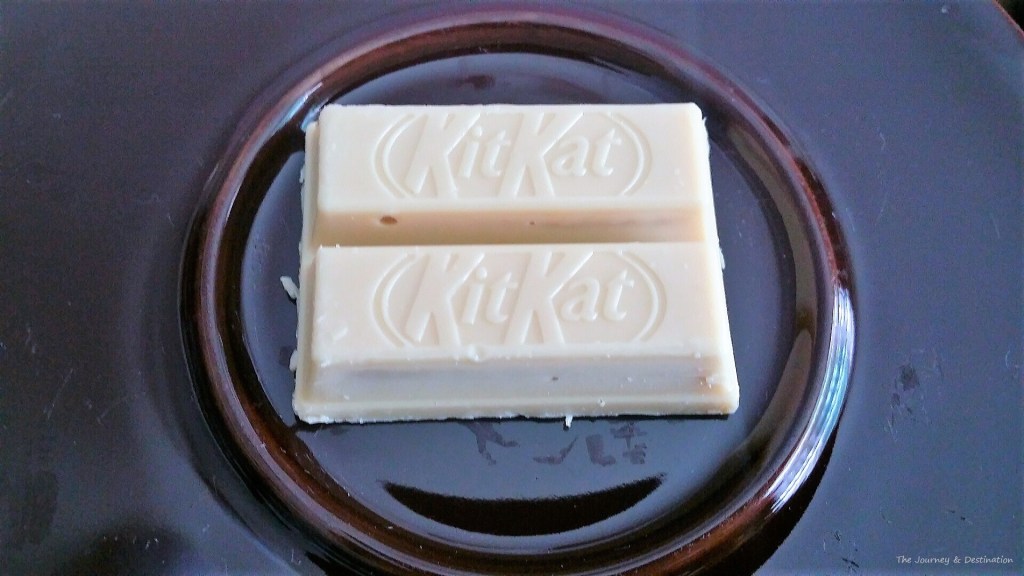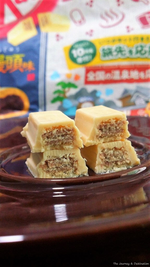 There are several varieties of manju in Japanese cuisine, and onsen manju is a delicate and fluffy steamed bun with an anko (red bean paste) filling. Kit Kat’s take on this delicacy features a white chocolate coat, with red bean cream (from red bean powder) sandwiched between wafer layers. The chocolate’s hue reflects the buns’ light-ish brown color, while the inside has a seemingly-chocolatey filling… which is actually red bean. And now, it’s the moment I’ve bean waiting for!