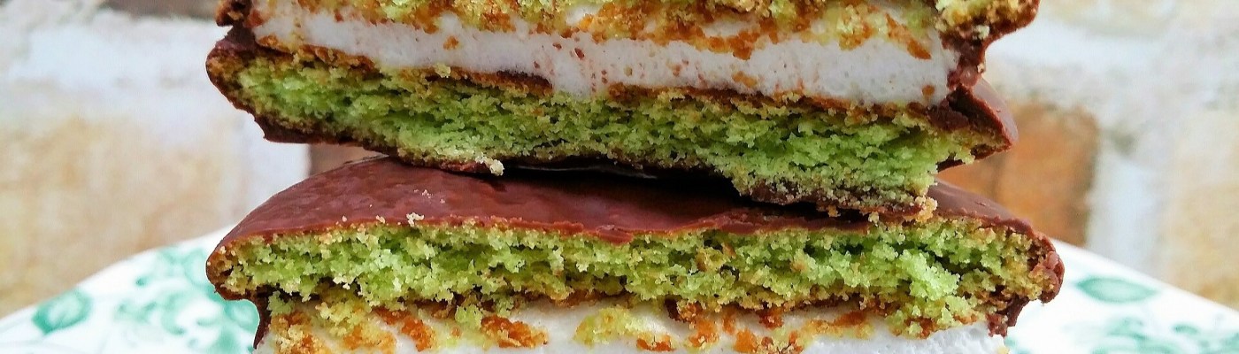 While I am not planning on pairing matcha with pasta or fruits (for now at least!), I am particularly excited to taste a matcha contribution from the snacks aisle that leaped into my shopping basket – matcha cakes smothered in chocolate and layered with marshmallow fluff. I hereby introduce my snack stash’s latest addition, green tea choco pies!