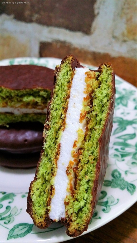 Stepping into my sleuthing boots to explore the art of baking these delights, I discovered that in order to nail the cakes’ thickness and disc-like shape, the cake batter is piped in individual circles that are reminiscent to how macarons are piped onto a baking sheet. Upon baking, the cakes are slightly thinner than macarons, and their diameter is longer than macarons’ (I’ve got to sprinkle a little Math since it’s Pi Day!) The cake ‘discs’, therefore, are wide enough to fit in your palm perfectly. The matcha sponge cakes sandwich a thick layer of marshmallow fluff, and chocolate coats the entire choco pie.