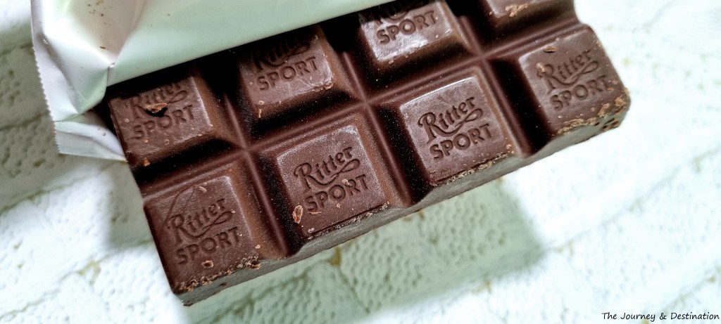 Ritter Sport’s marzipan dark chocolate is from the chocolate brand’s classic Colourful Variety range, which is available in all seasons. Upon sleuthing, I discovered that this marzipan chocolate is said to be vegan! It is part of Ritter Sport’s aptly yet lovingly-named ‘Accidentally Vegan’ collection, which shines the spotlight on chocolates from its regular ranges that happen to be vegan.