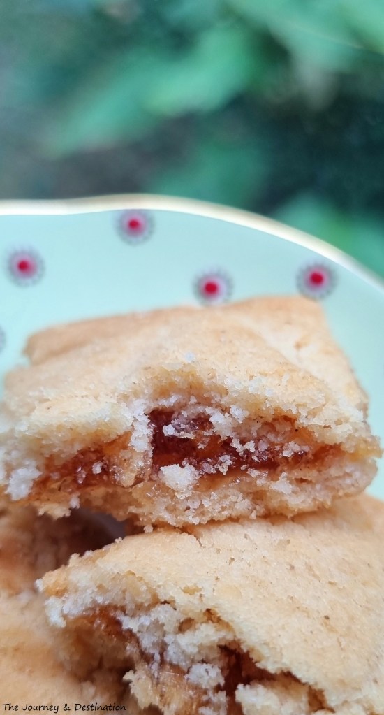 Admiring them from the side, these cookies have ‘cookie bar’ vibes from the 3 layers that are in a cookie-filling-cookie order. They echo strudel’s spirit too: from the rectangular shape, to little peeks of the strudel filling that depict a layered effect.