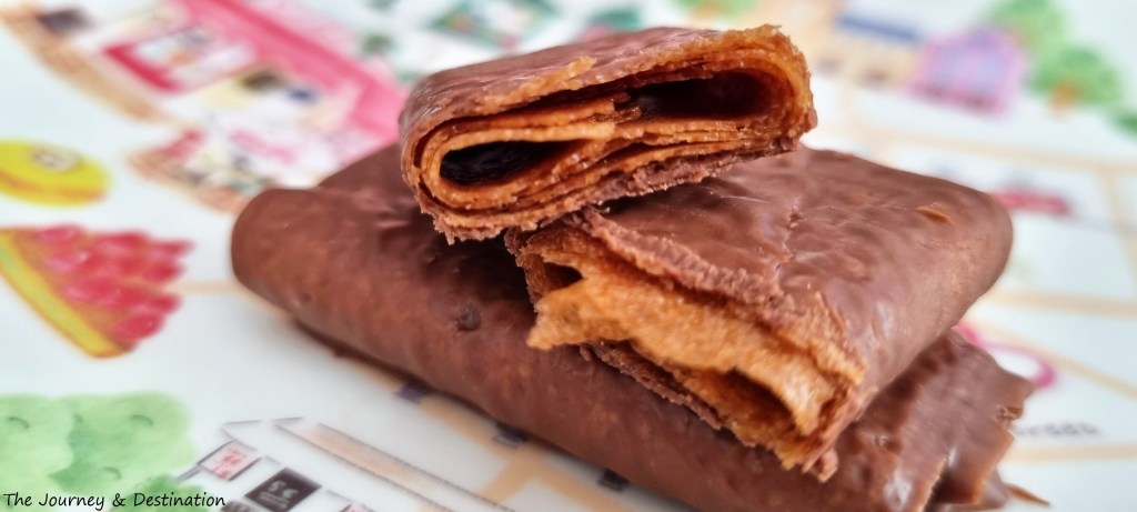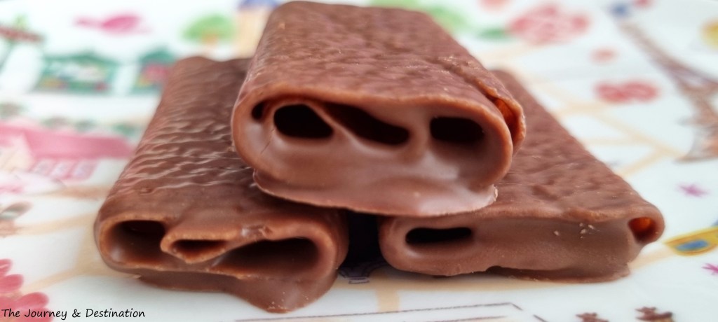 Crêpe’s presence arose further in my dissected dentelle through a folded swirl of caramel-brown batter, which reflects a crêpe that’s been cooked at the ‘well done’ level. While examining one of the halves that I was about to munch on, I noticed that the biscuit itself somewhat echoes the shape of hand-held folded crêpes from crêpe stands and stalls that fit the French street food vibe. The key differences – apart from being a biscuit – are that the dentelles don’t include fillings and milk chocolate’s presence is on the outside rather than in-between the swirled folds.