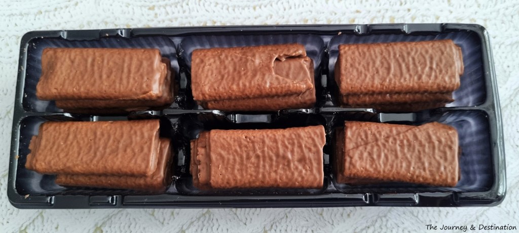 Looking at the biscuits from above, they sort of remind me of Australian Tim Tams because of their shape and the ‘wavy’ effect that appears on the chocolate coat. From the sides, the chocolate coat highlights the treat’s aesthetics, as it accentuates the definitions of the crêpes’ curved folds. This piqued my curiosity about what they look like on the inside.