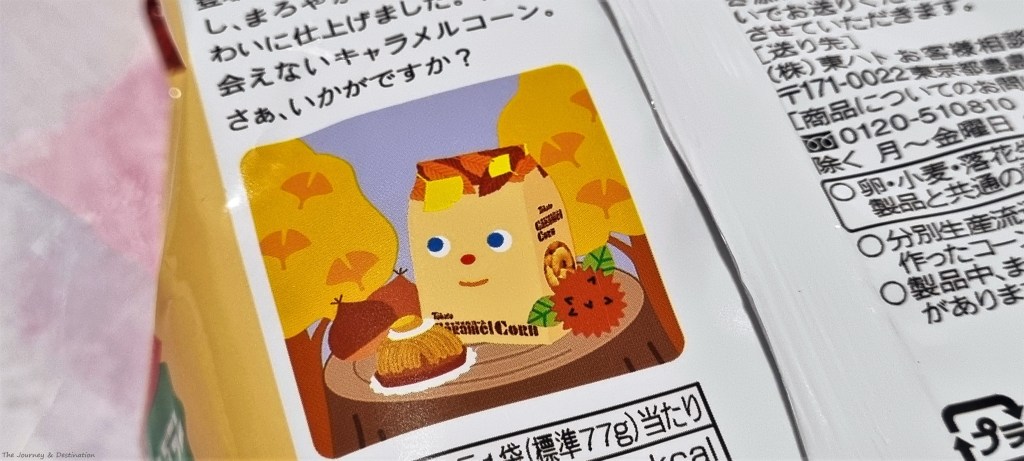 I love the little design details on the wrapper – from the autumn leaves to the mont blanc illustrations. In true caramel corn fashion, the wrapper has an expression that appears to be as prepared as foodies to begin snacking on its contents. Well, it’s going to have to share its sweet treats with me!