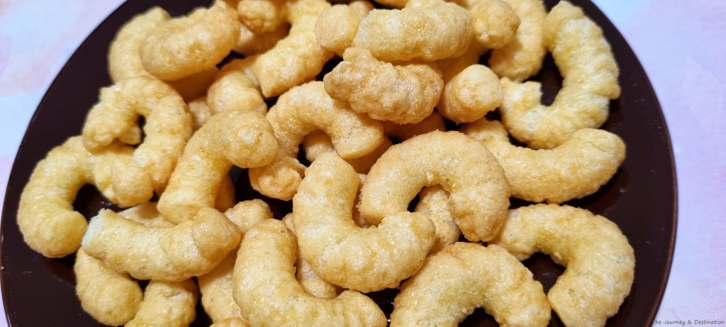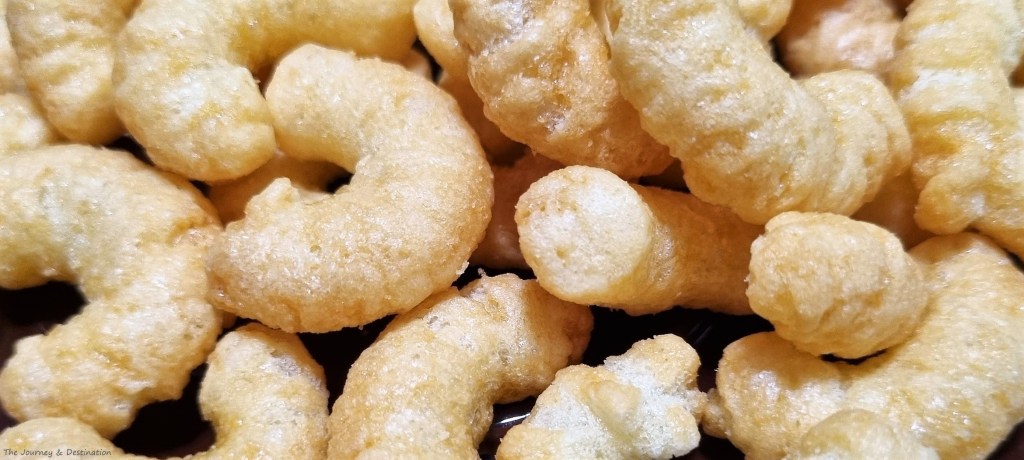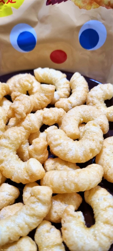 The corn puffs have a light golden-brown hue, and they possess the regular caramel corn shape. Admiring them through my camera, I realized they funnily remind me of both Cheetos and ebi (Japanese fried shrimp/prawn breaded in panko breadcrumbs) in a cute way. I couldn’t wait any longer to taste them!