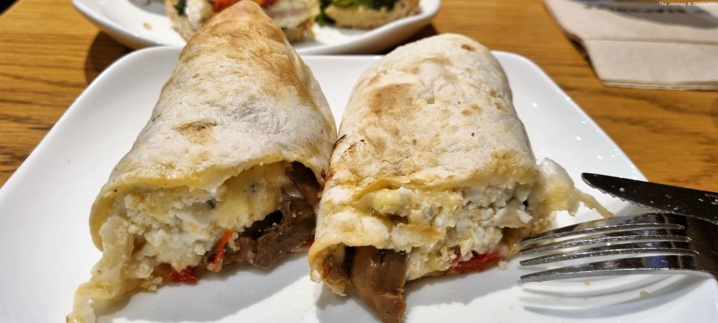 On the inside, my soft tortilla parcel is packed with elements that remind me of brunch. Scrutinizing my plate, all of the elements listed in the wrap’s name appeared to my eyes right away.