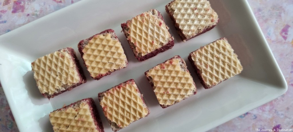 The wafers look identical to Loacker’s regular wafers, with the only exception being the cream in-between the wafer’s biscuit layers. It is a purple-colored cream, which, funnily to me, is in the shade of Barney the dinosaur. The pop of color is a fabulous touch to the wafers’ aesthetics, plus it brings a little whimsical vibe. It kind of reminds me of ‘unicorn’ foods such as the ice creams I tasted last year, particularly because of the purple. I’m certain that’s where the magical part comes from – sprinkles of unicorn’s spirit, with a little touch of Barney! Of course, no unicorns and dinosaurs were harmed in the making of this post.